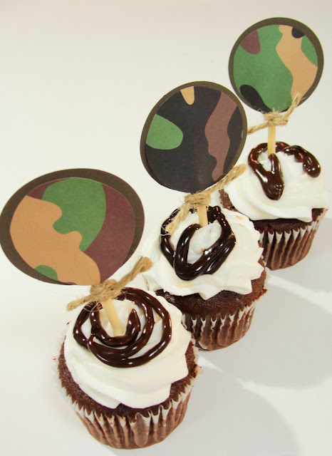 I cut bamboo sticks in half, making sure to get rid of any sharp ends, stamped out some circles and tied on some twine, and viola, decorated cupcakes. A lot easier than expected. I only had one size circle punch, so I stamped all of them with it, then handcut the camo ones a wee smaller to there would be brown space showing around the edges. Of course, I used hot glue for everything. So, you can make your own simple cupcake toppers, in a hurry even, much easier than I thought and you really don't need that many supplies.